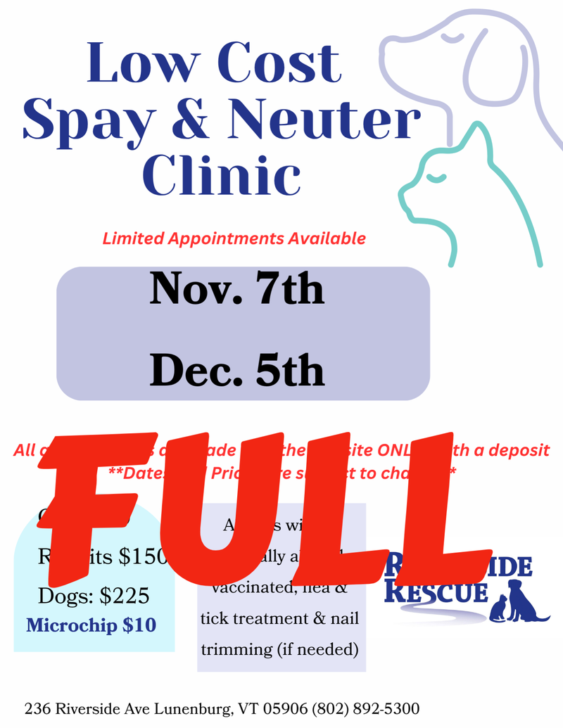 Our 2025 Clinics fill up fast and we still have a long list of female dogs that we need to try to help get spayed so at this point we are not sure when we will open spots for more female dogs. Please reach out to area veterinarians for other options.